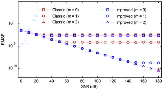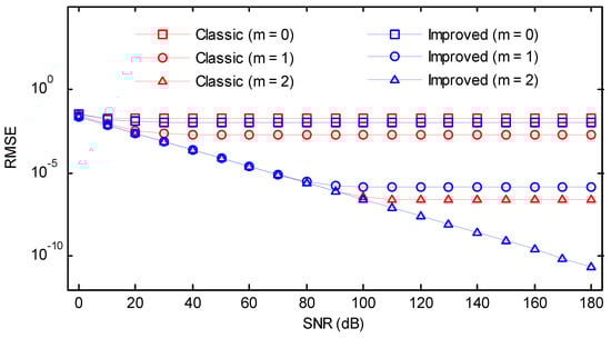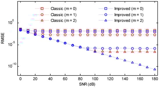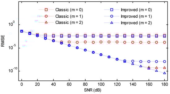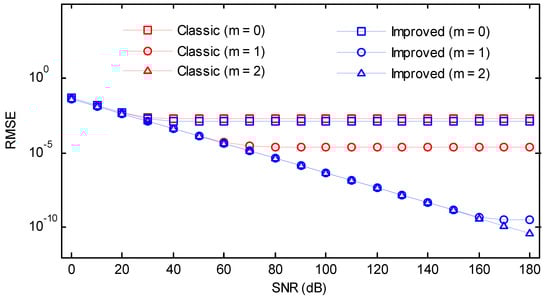 We also investigated the RMSEs of the classic and the improved secant method for a wide range of SNRs from 0 dB to 180 dB with a step of 10 dB. The normalized frequency, as well as the phase, were randomly chosen. The other simulation parameters were kept invariant. As can be seen in Figure 19, Figure 20, Figure 21, Figure 22 and Figure 23, for some conditions, the RMSEs may become flat after certain SNR as the bias becomes the dominant source of error. In the case where enough iterations were performed, the remaining bias could be completely eliminated, and the RMSEs were linear for the entire range of SNR. The figures were very informative regarding the trade-off between the bias and variance for different iterations. Without iterations, the classic method was first saturated at SNR ≈ 10 dB, followed by the improved method. If an iteration was performed, the values for the improved method sharply decreased, and the RMSEs were much smaller and less than 10−6. However, a high level of RMSEs remained for the classic method. If two iterations were performed, the RMSEs of the improved version would be merely dependent on the random noise, while for the classic method, the bias may still be significant when a high SNR was encountered. In most practical situations, the influence of noise is usually more important than the bias. As a result, one iteration was sufficient for the proposed algorithm to produce satisfactory results even in the presence of noise.