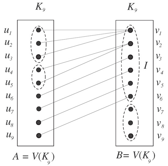 Let G be a complete graph and let be a function such that . Without loss of generality, assume are those vertices of A such that , where in B. In addition, for all , where . By using the similar labeling f as defined in Lemma 7, at least colors are needed to break these automorphisms in . Thus, we have the following proposition: