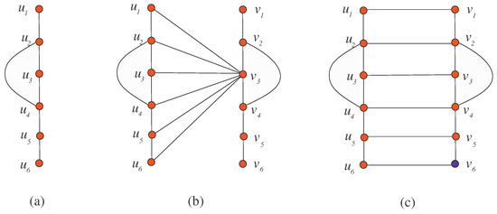 We discuss an example for Proposition 1, where we consider a rigid graph G with the smallest number of vertices i.e., as shown in Figure 2a. Since , we label its vertices with a red color. Figure 2b shows , when g is a constant function. In this case, is a rigid graph and hence . Figure 2c shows , when g is the identity function. In this case, has a non-trivial automorphism i.e., horizontal flipping of . We label vertex of copy with blue color to break the non-trivial automorphism. Hence, .