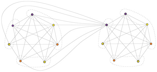 Let . In the functigraph , we label the vertices in copy of G with colors. Now, v is the only vertex of with the largest degree (as we can see in Figure 2b and is the vertex of with the largest degree); therefore, it is not similar to any other vertex of and hence it can also be labeled with one of colors. Thus, vertices in are labeled by colors. Since g is a constant function, all vertices in are not similar to any vertex in in functigraph . If two disjoint subsets of vertices of a graph are such that every vertex of one set is not similar to any vertex of the other set, then the vertices of both sets can be labeled by the same set of colors; therefore, the vertices in and can be labeled by colors. Hence, . ☐