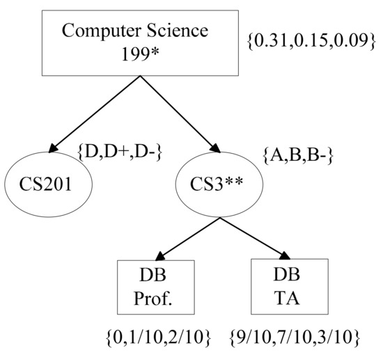Hospitals and other organizations often need to publish data, e.g., medical data or census data, for the purposes of scientific research and knowledge-based decision-making [1,2,3,4,5,6,7,8,9,10]. To avoid the leakage of individual privacy, explicit identifying information is removed when data is released. However, individual privacy still could be leaked by linking other public data [11]. Privacy-preserving data publishing provides methods and tools for publishing useful information while preserving individual privacy [12]. In recent years, the problem of privacy-preserving data publishing has been studied extensively. The existing privacy protection methods mainly focus on relational data, and many mature privacy models are proposed, such as k-anonymity [11], l-diversity [13], (α, k)-anonymity [14] and t-closeness [15]. However, data often has a complicated structure in the real world. With the advent of document-oriented databases (e.g., MongoDB) and the wide use of markup languages (e.g., XML), hierarchical data has become ubiquitous [16]. To avoid the leakage of individual privacy, the hierarchical data must be properly anonymized before it is released. At present, there are few researches on privacy protection for hierarchical data. Ozalp et al. [16] proposed l-diversity anonymous methods for hierarchical data. An example for hierarchical data is given in Figure 1. The schema for education data is obtained from Sabanci University [16] and the examples appearing in this paper are related to the schema. Figure 1a represents a student’s record, which fits the education schema shown in Figure 1b. The student is born in 1990 and majors in Computer Science. He took two courses, CS201 and CS305. For CS201, his evaluations are submitted for two instructors. For CS305, he submitted an evaluation and showed he bought a database book. The labels of vertices are all quasi-identifiers (QIs) of the student and the corresponding sensitive information is remarked in the side of every vertex. Quasi-identifier is a set of attributes that can potentially identify an individual [11]. Assume that an attacker knows some QIs of a victim, and his goal is to reason the sensitive information of the victim. In [16], they used suppression and generalization [11] to make the anonymous hierarchical dataset satisfy l-diversity, which ensures the frequency of every sensitive value for the union-compatible vertices (belonging to the same vertex in schema) in an equivalence class is not more than 1/l. The constraint also can guarantee that every equivalence class contains at least l hierarchical data records. An equivalence class in an anonymous hierarchical dataset is a set of records with the same values for the QIs. However, the method does not consider the sensitivity of different sensitive attribute values, which lead to similarity attacks [15]. For example, an equivalence class contains three hierarchical data records and its class representative is shown in Figure 2, which satisfies 3-diversity. The sensitive values of their cumulative GPAs are 0.31, 0.15 and 0.09, respectively, where GPA is the grade point average. An attacker knows a victim in the equivalence class by linking with some QIs of the victim. Although the attacker does not infer the victim’s specific sensitive value, he can know that the victim’s academic performance is low with 100% probability and the victim’s privacy is leaked. Similarly, the attacker can confirm that the grade of the victim in the course CS201 is very low according to the value {D, D+, D−}. Also, the attacker can infer that the victim is very dissatisfied with the DB Prof. by the value {0, 1/10, 2/10}. To avoid similarity attack, we propose a multi-level privacy-preserving approach in hierarchical data based on fuzzy sets.