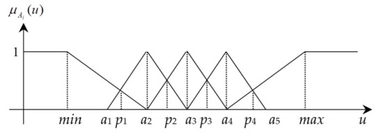 Let U be a universe of discourse. A mapping μA: U → [0, 1] is called a membership function on U, where the set A, which consists of μA(u) (u ∈ U), is a fuzzy set on U, and μA(u) is the membership degree of u to A [30,31,32]. The trapezoidal distribution [33] is used to give the membership functions for fuzzy sets low, very low, middle, very high and high, denoted by A1, A2, A3, A4, and A5, respectively. Let U be the domain of a numerical attribute (for categorical attribute, a numerical attribute can be obtained according to the frequency of every value), and min and max be the minimum and maximum values in U, respectively. The five fuzzy sets have values in the range [min, a2], [a1, a3], [a2, a4], [a3, a5] and [a4, max], respectively, where a3 = (min + max)/2, a1 = min + (a3-min)/3, a2 = min + 2(a3-min)/3, a4 = a3 + (max-a3)/3, a5 = a3 + 2(max-a3)/3. That is, a1, a2, a3, a4 and a5 uniformly divide the interval [min, max]. The membership functions for Ai (i = 1, 2, ..., 5) are shown as follows.