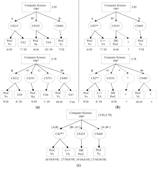 An anonymous example of two hierarchical data records is shown in Figure 4, where Figure 4a–c are two raw hierarchical data records, with their anonymous results identical to (, 2)-anonymity, and their class representative, respectively.