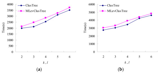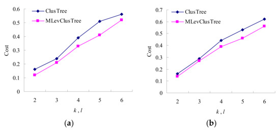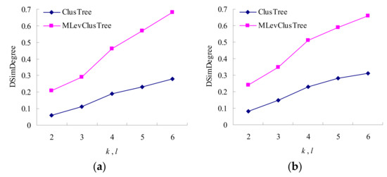 The security of our MLevClusTree and Clustree is evaluated by the dissimilarity degree of equivalence class, and the results are shown in Figure 6. The ordinate denotes the average dissimilarity degree of an equivalence class. For an equivalence class, we can use Equation (7) to obtain its dissimilarity degree. Therefore, the results of dataset A with h = 2 and dataset B with h = 3 are not significantly different. As k increases, there are more sensitive values in different sensitivity levels, and the dissimilarity degree of a vertex in the class representative of an equivalence class increases. So the average dissimilarity degree of an equivalence class increases. From Figure 6, we can see that the average dissimilarity degree of an equivalence class for our MLevClusTree is higher than that for Clustree, since our approach restricts the proportion of sensitive values in different sensitivity levels. Therefore, our approach enhances the ability to resist similarity attacks and improves the data security.