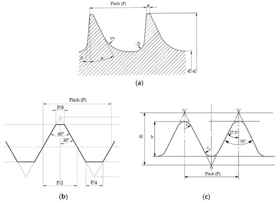 Threaded parts are the most widely deployed mechanical joint in machinery design. The most common threads for machinery are symmetric ones, typically metric and Whitworth, see Figure 1b,c. A key characteristic of a joint is the load distribution pattern through the threads along the depth path of the joint. This pattern helps when analyzing the joint’s performance in some applications, especially if the material characteristics of the joint parts are rather different from those of the fastener part. That is the case of surgical screws, applied to fasten bone plates to heal broken bones in reduction procedures. Screws and plates are usually made of stainless steel or titanium and both have similar success rates in fracture fixation applications. In terms of deployment, there is a preference for stainless steel orthopaedic devices in the USA and for titanium in Europe [1]. For screws, stainless steel allows better torque control but the tissue integration with titanium shows smaller inflammatory responses [1,2]. Since we focus this work on the thread geometry, we chose stainless steel as the reference material to perform this study, without lack of generality.