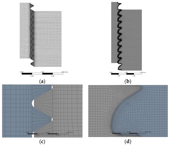 Drawing of the geometry and mesh defined for the two-dimensional axisymmetric Finite Element (FE) models. Upper panels: general view of threads ISO68 (a) and ISO5845-HA (b). Note that the number of inserted threads is the same in both cases. Lower panels: detailed view of threads ISO68 (c) and ISO5845-HA (d). The scale is now the same and the different size is given by the thread pitch definition.