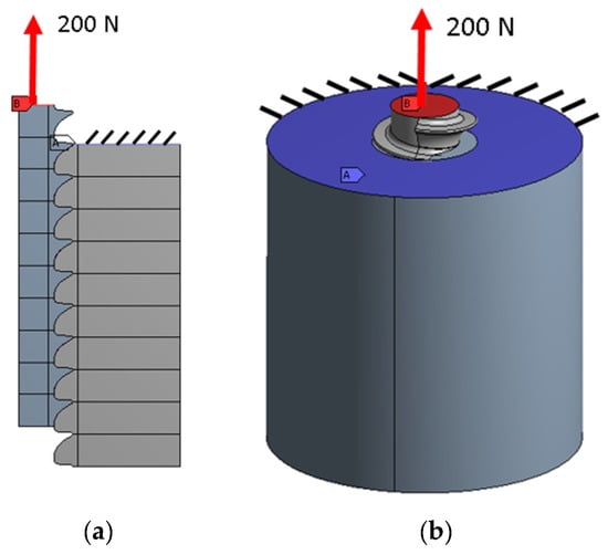 The numerical methods applied to mechanical calculations allowed major new approaches to more complex cases, and were immediately applied to the analysis of joints—always critical parts of any mechanical assembly. In the initial studies, using Finite Element (FE) methods the joints were modelled by using an axisymmetric description [11,12,13,14]. Typically, the authors revisited the state-of-the-art analytical models to cross check the results and search for possible influencing effects lying beneath the simplifications introduced, which the powerful numerical tools could directly address. The models also grew in complexity by introducing three-dimensional effects caused by the real helical geometry [15] and the pre-loading of the joint with a calculated torque [16,17,18] usually applied to bolts. Typically, geometric models are defined with sufficient detail so as to reproduce the thread effects in the parts. This search for detail has meant that the need for model definition and computing time is continuously increasing and the study of multi-joint assemblies has become a highly time-consuming problem that includes complex contact modelling.