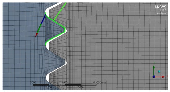 The model was defined with a mesh of rectangular linear elements (PLANE 182 type in the software) with axisymmetric option. Due to the different geometrical characteristics of the symmetric and non-symmetric screws, we selected different element sizes in the contact region, which is especially important to define the curvatures of the HA thread properly, see Figure 2. We used 0.015 mm element size for the model of ISO68 threads producing 6500 elements, with a structured mesh; and 0.010 mm element size for the model of HA threads producing 36,000 elements. Mesh sensitivity analyses showed a correct convergence.