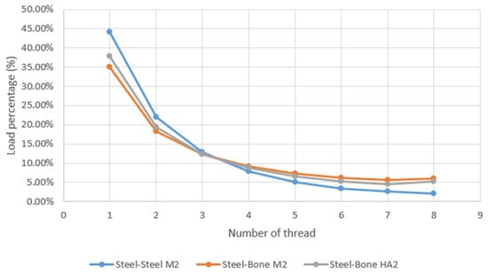 The results provided the contact stresses at the thread contact, tensional states and internal deformations. The contact load evaluated at each thread of the joint normalized with respect to the overall of 200 N applied to the screw was then plotted. In order to perform such a computation, we divided the whole contact definition as shown in Figure 4. Thus, one single contact surface for each thread is defined; all of them are defined with the same conditions. Defining contacts separately allows to compute the total load at each thread. Therefore, since contact pressure is computed during the solution process, the integral extended to each contact surface provides the total load supported by the thread. Figure 5 depicts the load normalized with respect to total applied load. As stated [3,4,5], the load of the first thread takes the highest value but it then diminishes continuously through the grip length. There are differences depending on the material combination due the trade-off effects caused by the different rigidities involved. The steel-steel and steel-bone cases differ up to 25% in the higher loads, when comparing the same ISO68 thread. The more compliant bone causes a more even sharing of load between threads. The HA thread causes a slightly higher load than the ISO68 for steel-bone contact but the differences are lower than 5% in the initial threads.