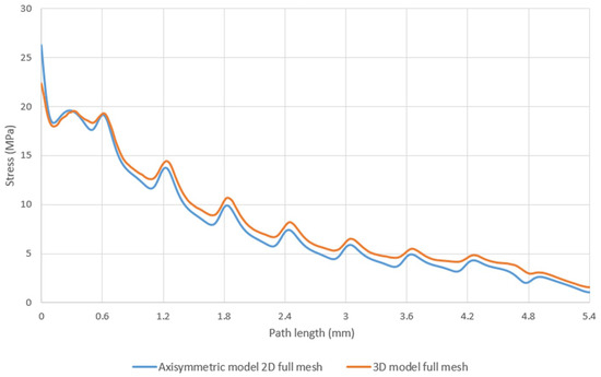 Figure 11 plots the results of stress along a path, similarly defined as before, at distance 0.25 p, the pitch value now being 1.75 mm. In these tests, a force of 500 N was applied. This value is rather low, compared to the case analyzed for 2 mm, in terms of the values of stress state produced. Therefore, the application of the model to different sizes and also different relative loads is tested simultaneously. As shown in the results, the stress state values are again rather similar for both the two-dimensional FE model and the simplified model, with differences in the same range for the higher peaks. Possible effects caused by the size-scale can then be excluded in the application of the simplified model preserving the conditions on mesh size.