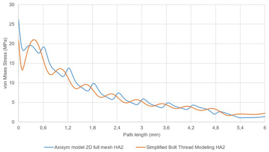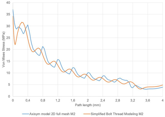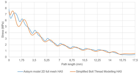 The results obtained for ISO68 M2 and HA 2 mm analyzed with the two-dimensional FE model and compared with the simplified model, with the proper parameterization, show deviations of stress of about 7–8%. However, we have found differences up to 40% comparing the stresses caused by threads M2 and HA (see Section 2, Figure 6). The different values defining the model thread parameters: thread diameter, pitch diameter and pitch make possible a proper stress evaluation, despite the fact that the geometry is rather different considering the character of ISO68 (symmetric) and HA (asymmetric) threads.