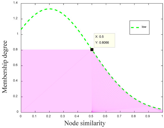 Additionally, for the sake of the requirement of low computation in mobile devices, the three different membership functions (low, medium, and high) for the node similarity can be defined as the above system of Equations (16), and their geometric graph is shown in Figure 2. In mathematical expressions of the three membership functions, different values of the node similarity correspond to three different levels in the above system of Equations (16). For instance, when , it corresponds to , , and for the three different fuzzy sets of mobile similarity.