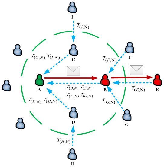 Ordinarily, traditional routing algorithms in opportunistic social networks select a suitable relay node only from the neighbors, but the feedback mechanism in our proposed algorithm pays attention to not only the neighbor nodes, but also the second-hop nodes. As shown in Figure 4, the source node A needs to send a message to the destination N. After the warming-up phase, each node obtains detailed information about the state of the network and computes the transmission preference value using the destination N. After that, the source node A starts to collect and compare the transmission preference values from its future two-hop nodes. The source node forwards messages to the future two-hop nodes, which have a higher transmission preference with the destination than its own. In Figure 5, the nodes B, C, and D are neighbors of the source node A; the nodes E, F, and G are neighbors of the node B. Because and , the source node A only sends messages to the neighbor node B, and the node B then forwards messages to the second hop E. Finally, data packages will be delivered to the destination node N based on the feedback mechanism.