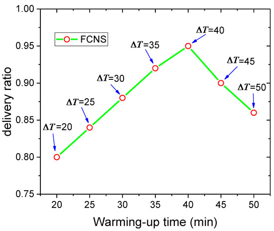 Firstly, we explore the impact of warming-up time on delivery ratio. As shown in Figure 6, the broken line first rises sharply, and then falls rapidly. In other words, when the value of the warming-up time is increasing, the delivery ratio rises at first and then decreases, and reaches the maximum value 0.95 when the length of the warming-up phase is 40 min. As the warming-up time increases, all nodes in the network may obtain more information about the state of the network. Accurate calculation results of node similarity will be acquired by the message carrier, and the source node can select suitable and reliable relay nodes through these precise transmission statistics. However, a long warming-up phase means each node in the network needs to carry, transport, and process more irrelevant information in the data transmission process. Meanwhile, frequent communication of information between nodes will consume a lot of the energy of mobile devices in the network, and a severe lack of energy may result in the slow movement of users. Additionally, both information collection and message forwarding require some computing tasks, so these computing tasks executed by nodes also have to consume the cache spaces and energy of users, which may cause large resource consumption and reduced delivery ratios in the network.