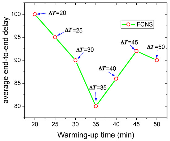 Secondly, the influence of the warming-up time on average end-to-end delay is demonstrated in Figure 7. As presented, the broken line first declines rapidly and then rises slowly. When the value of the warming-up time is 35 min, the average end-to-end delay of the FCNS algorithm achieves the minimum value of 80. With the increase of the warming-up time, frequent information exchanges between nodes can establish sufficient statistics about the attribute characteristics of the node in the network. Moreover, the message carrier is able to choose the optimal two-hop nodes and less time is spent on successful data transmission. However, for an overly long warming-up time, excessive information carried by nodes in the network may lead to the lack of energy and memory of nodes, implying that it takes more time to route and transmit messages in the data transmission process, and the average end-to-end delay then begins to go up.