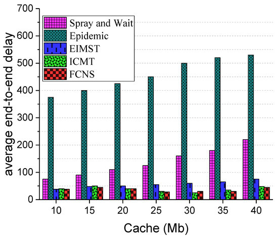 Next, Figure 10 exhibits the comparison results between the five different algorithms in terms of average end-to-end delay. As shown in the figure, the average end-to-end delay of each algorithm is rising with the increase of the cache space of nodes. Clearly, when the cache space of the node rises from 10 Mb to 40 Mb, the average end-to-end delay of the FCNS algorithm remains relatively stable and is always the lowest among these algorithms. This is due to the fact that the FCNS algorithm makes message delivery decisions by determining and comparing the similarity degree of the node, and the transmission preference plays a decisive role in the data transmission process. Additionally, an increase in the cache space does not have a significant effect on the mobile information and social attributes of nodes—thus, the delay of routing selections, of relay nodes waiting for messages, and of message forwarding are only a slight change. Comparatively speaking, the Epidemic algorithm manufactures a large number of message group copies in the network, which causes a sharp increase in the routing and forwarding delays of the message. The Spray and Wait algorithm effectively limits the number of message copies, so the average end-to-end delay of the algorithm is lower than the Epidemic one. Besides, the EIMST algorithm implements community division and information management, while the ICMT algorithm adopts a cooperative mechanism to realize the reasonable utilization of cache spaces of the node. Therefore, the average end-to-end delays in the EIMST and ICMT algorithms are obviously lower than the traditional algorithms. To sum up, compared with other algorithms, the FCNS algorithm is the optimal method to improve average end-to-end delays in the network.
