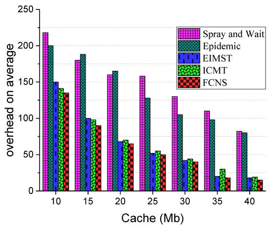 Eventually, the comparison results between the five different algorithms in terms of overhead on average are demonstrated in Figure 11. Overall, when the cache space of the node increases from 10 to 40 Mb, nodes in the network may possess sufficient resource spaces to store statistics and to process the computing tasks, meaning the overhead on average of each algorithm is continuously and dramatically decreasing. Additionally, the overhead on average in the FCNS algorithm always keeps the lowest, because it adopts a comprehensive node similarity to implement the optimal process for data transmission in opportunistic social networks. In the FCNS algorithm, mobile and social similarities mainly reflect the special social relations between nodes, and there is a high probability of successful message transmission between two closely related nodes. Therefore, in the FCNS algorithm, the total number of hops for a complete communication between the source node and the destination is relatively less. The routing and forwarding of messages take only a small amount of time and resources in the network, and the overhead on average has been significantly improved in the data transmission process. In the Spray and Wait algorithm and the Epidemic algorithm, redundant message group copies need to consume masses of time and resources, meaning the overhead on average is obviously higher than the other algorithms. As for the EIMST and ICMT algorithms, the efficient management for the information and cache space of nodes conduces to allocate resources properly and to control transmission time, so the overhead on average of the two algorithms is at an intermediate level all the time. In conclusion, in terms of the overhead on average, the FCNS is always the best performing one among the five algorithms.