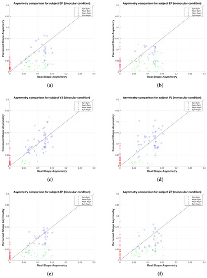 Perceived vs. real asymmetry of shapes for (a) subject EP (binocular); (b) subject EP (monocular); (c) subject VJ (binocular); (d) subject VJ (monocular); (e) subject ZP (binocular) and (f) subject ZP (monocular).
