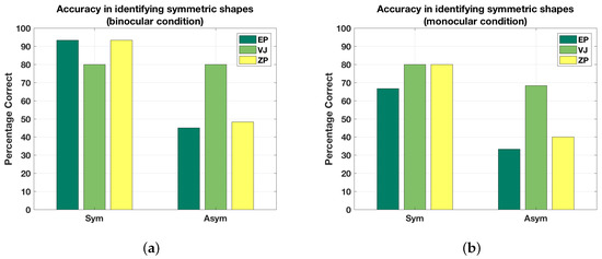 Accuracy in identifying symmetrical and asymmetrical shapes in (a) binocular and (b) monocular condition. Recall that there were 30 symmetrical and 60 asymmetrical shapes.