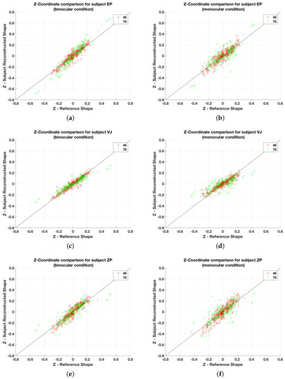 Subject shape vs. reference shape depth plots for symmetrical shapes for (a) subject EP (binocular); (b) subject EP (monocular); (c) subject VJ (binocular); (d) subject VJ (monocular); (e) subject ZP (binocular) and (f) subject ZP (monocular). The numbers 45 and 70 indicate viewing directions. The green x marks include both 20 and 70 viewing directions.