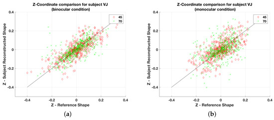 Perceived vs. real depth plots for asymmetric shapes for subject VJ in (a) binocular and (b) monocular condition.