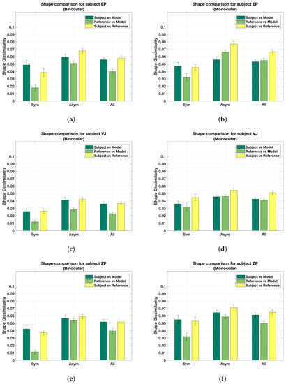 Shape dissimilarity for (a) subject EP (binocular); (b) subject EP (monocular); (c) subject VJ (binocular); (d) subject VJ (monocular); (e) subject ZP (binocular) and (f) subject ZP (monocular).
