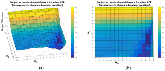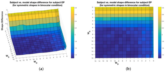 Subject vs. model shape difference, as function of the model weights, for symmetrical shapes, for the subject EP, in the binocular condition. (a) and (b) represent two views of the same shape difference plot.