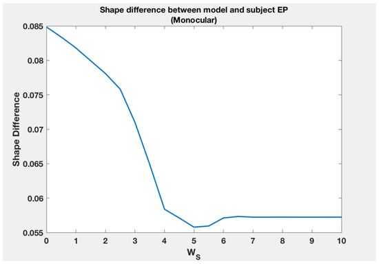 For asymmetrical shapes, the weight of the asymmetry term relative to modified compactness is similar in monocular and binocular conditions for subjects VJ and ZP. For asymmetrical shapes, if the binocular model weights for VJ are used for the monocular model of VJ, the average subject shape vs. model shape difference would go up by 0.0094. Doing the same for subject ZP would lead to an increase in the average shape difference of 0.0022 between the subject and the model. These are not large changes. For asymmetrical shapes for subject EP though, the weight of the asymmetry term seems to be very different across the two conditions. However, as shown in Figure 10, assigning = 10, for asymmetrical shapes in the monocular condition for subject EP, will not lead to any substantial change in shape difference with subject shapes. Therefore, for all three subjects, the weight of asymmetry relative to modified compactness is similar across conditions.