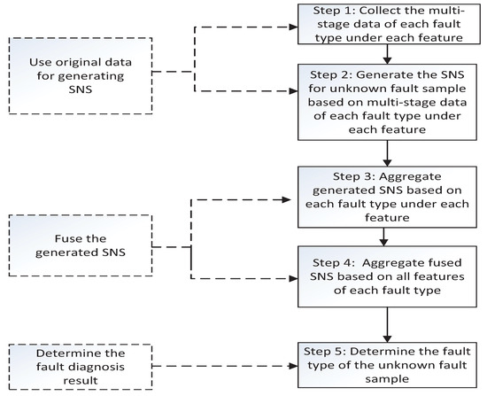 - Aggregate the fused SNSs based on all features of each fault type. Fusing the SNNs is based on the four features of each fault type by the SNWA operator, Equation (5). In addition, it is supposed the weights (w) of the four SNNs are . For example, the SNNs based on fault type could be fused as follows:The others are shown in Table 5.