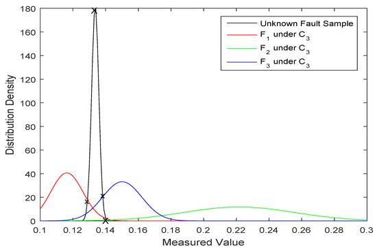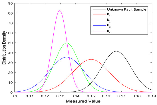 - Generate the SNS for an unknown fault sample (S) based on the multi-stage data of each fault type under each feature. For each stage’s data for each fault type under every feature, and for the data of every feature of the unknown fault sample (S), a normal distribution model is established which is obtained by using the arithmetic average (m) and variance () of a stage’s data as the arithmetic average and standard deviation of the normal distribution model, denoted as . Then, k normal distribution models and k normal distribution figures are generated according to k stages of data of each fault type under each feature. In addition, a normal distribution model is generated based on the data of the unknown fault sample under each feature. The normal distribution figures generated from the data of of unknown fault sample S and k stages of data for of are shown in Figure 2. As the figure shows, each stage’s data collected drift to a certain extent in a certain range. In particular, there are distinct differences between the fault type’s data collected in the fourth stage and the data of the unknown fault sample.The normal distribution function indicates the distribution probability density of the data. The membership degree of SNS is defined as the ratio of the maximum value of the vertical coordinate of the intersection point between the unknown fault sample and the fault type and the peak value of the unknown fault sample. The two normal distribution curves (Figure 3) and the definition of the membership degree () are as follows:where represents the maximum value of the vertical coordinate of the intersection point of distribution between the unknown fault sample (S) and the fault type (), and represents the peak value of the unknown fault sample’s distribution.As the figure shown, the intersection points of distribution between the unknown fault sample and are marked with X, and the peak point of S’ distribution is marked with X in the same way. Then, from the Equation (6), the membership degree is generated.In this paper, it is assumed that the non-membership degree and the membership degree are interdependent. The indeterminacy-membership degree indicates the uncertainty degree of neutrosophic information. Entropy represents the uncertainty of the information and has been widely used in many fields. Shannon introduced the quantitative and qualitative model of communication as a statistical process that underlies information theory [55], which is a formalism that was originally applied to digital communication. The indeterminacy-membership degree and non-membership degree are defined as follows:The indeterminacy-membership degree () represents the Shannon entropy of the membership degree () and the non-membership degree (), and equals 0 if or equal 0. Hence, the SNS can be obtained. The generated SNS is shown in Table 1: