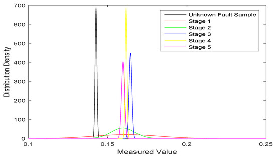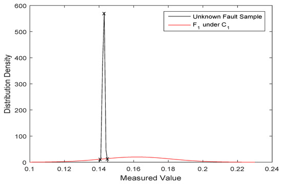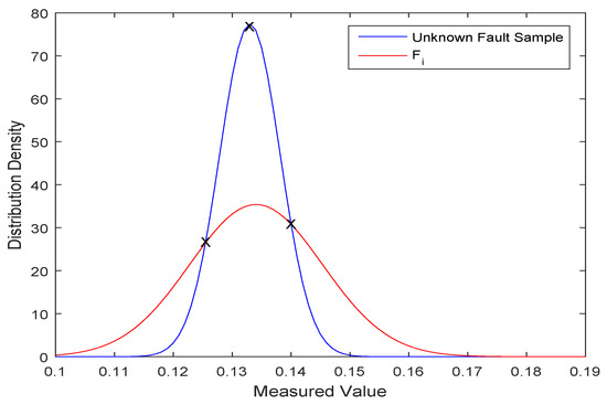 - Generate the SNS for the unknown fault sample based on the multi-stage data from each fault type under each feature. Each stage’s data collected is used to establish the normal distribution model. The generated normal distributions of fault types and the unknown fault sample are listed in Table 2. For instance, the normal distribution of data and with five stages of data is shown in Figure 4. As the figure shows, each stage’s data collected drift to a certain extent in a certain range. In particular, there were distinct differences between the fault types collected in each stage and the data of unknown fault samples. Therefore, it is significant to collect data in multiple stages and to use its integration with the neutrosophic set to deal with the uncertainty of fault information.Then, are calculated with Equations (6) and (7). For instance, the distribution of was , the normal distribution of ’s first stage of data was , and the membership degree of SNN generated from the two distributions is shown in Figure 5. As the figure shows, the intersection points of distribution between the unknown fault sample () and ’s first stage data are marked with X, and the peak point of ’s distribution is marked with X in the same way. Then, from the Equations (6) and (7), the SNN was generated and denoted as . The generated SNSs are listed in Table 3.