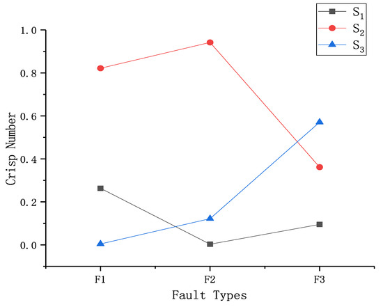 - Determine the fault type of the unknown fault sample. Finally, Table 5 can be regarded as an SNN fault diagnosis matrix which can be used to rank the three fault types via the defuzzification method (Equation (10)). The descendant ranks of the crisp numbers of the three fault types are shown in Table 6.