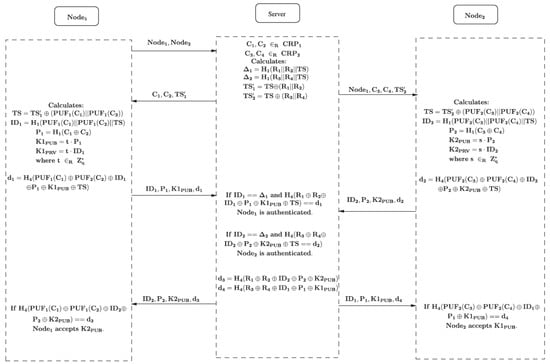 - Authentication of the Server. The server is authenticated by the node in both received messages. In the first received message by Node 1, the value , computed by the server, includes , while this value is not part of the received message. Instead, is masked by a hash value, which includes the response on the first challenge. Consequently, as only the server is aware of the challenge–response pairs, Node 1 ensures that the server has sent the message. In the second received message, the hash value is included. This hash value contains the responses on the two challenges, which is only known by the server. Due to the symmetry of the protocol, the same reasoning holds for Node 2.