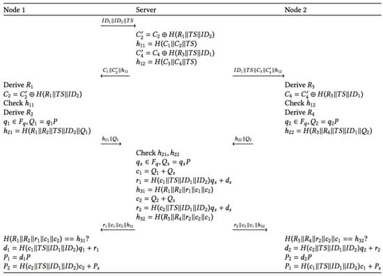 - To start the key agreement phase, Node 1 shares with the server the identities of Nodes 1 and 2, respectively, together with the current timestamp . Node 1 opens a new session and stores the three parameters in it.