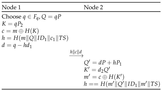 - When a message of four parameters of expected length is received, Node 1 opens the stored session(s) where the current timestamp is in a reasonable timeframe with the stored timestamp. Node 1 first checks the hash value . If OK, it continues with the computation of its private key . Its public key equals , but also toConsequently, given the publicly available values , everybody is able to compute this key. The private key is only known by the node itself. Using , Node 1 is able to compute the public key of Node 2. Note that this mechanism is based on the ECQV Implicit Certificate Scheme [11]. After a successful generation of the key material, both nodes close the stored session and open a new session storing its private and public key pair together with the public key and identity of the other node.