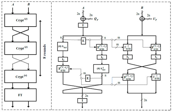 (a) The general structure (left); and (b) round function Crypt(0) (right) of BM123-64.