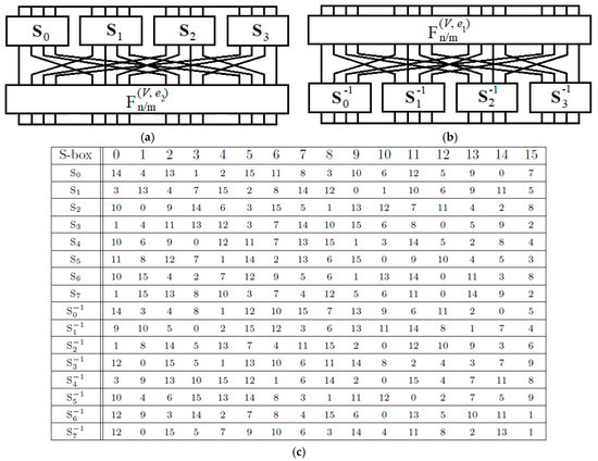 The hybrid CSPN construction is designed based on the description of permutation function structure covering eight 4 × 4 S-boxes (S0, S1, S2, S3 and S−10, S−11, S−12, S−13) with SDDO-based function . Figure 3 presents the CSPN with its S-boxes in structure.