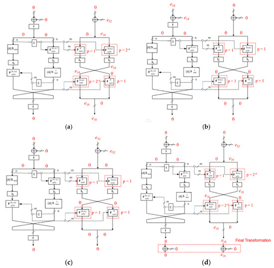 Differential characteristics (DCs) in Crypt(e) function at (a) the first round; (b) the second round; (c) the fifth round; and (d) the eighth round and final transformation of BM123-64 with Case 2 and Case 3.