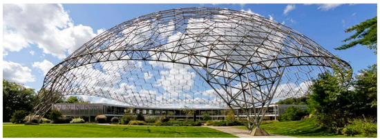 Geodesic spatial frame approximating a quadric surface: American Society for Metals International Headquarters and Geodesic Dome, at the Materials Park campus in Russell Township, Ohio, United States (Source: https://theredlist.com/wiki-2-19-879-605-285216-view-buckminster-fuller-richard-profile--1.html).