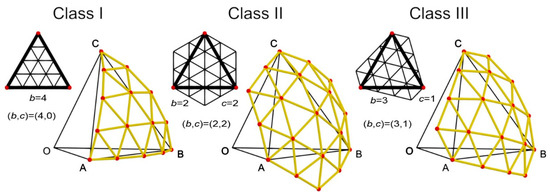 Different classes for geodesic structures depending on the orientation of the triangular tessellation with respect to the basic triangle (parameters b and c) as explained in the literature [11].