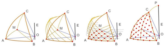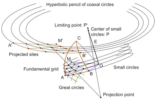 The following procedure will be used to propagate a fundamental grid in the projection of a regular spherical triangle (see Figure 3 and Figure 7). The starting point is the definition of the points A’, B’, C’, and O’ on the inversive plane by using stereographic projection, as well as the equatorial great circle.
