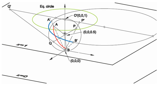 Similarly, Figure 6 shows the homologous transformation of an inversion on the sphere, with respect to a reference circle c [18] passing through points A and B. This curve is projected into c’ and those points into A’ and B’, which are self-inverse points (A’→A’, B’→B’). The constant of the inversion is established by setting the correspondence of any point with its transformed. With respect to any circle on the sphere, the polar points (P and Q) of the axis (PQ) perpendicular to the plane of such a circle are transformed into each other (P’→Q’).