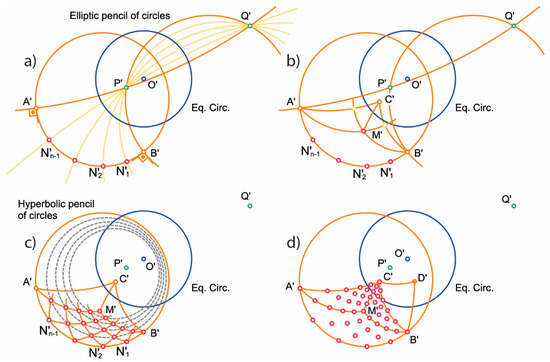 Let us consider the known the projections on the plane (A’, B’, C’) of the vertices (A, B, C) that define the spherical triangle (Figure 4), as well as the projection of the equatorial great circle (intersection of the sphere with the plane z = 0.5). In the stereographic projection, great circles and concentric small circles are transformed into elliptic lines and hyperbolic pencils of coaxal circles, respectively [14].