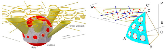 In this case, each cell of the power diagram will lead to a face of the polyhedron approximating the quadric surface, which can cut, or not, such a surface (Figure 8, right). If this happens, the section produced by the intersection is stereographically projected onto the plane as one of the circles of the power diagram.