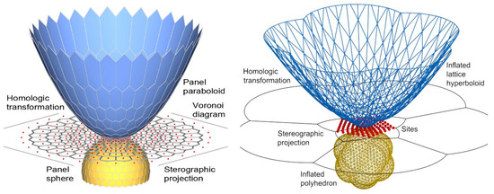 After obtaining the polyhedron approximating the sphere, it is possible to apply a specific homological transformation to the sphere (or to the obtained polyhedron) in such a way that the result is an elliptic quadric surface (or the approximating polyhedron). Figure 10 (left) shows an application to a paraboloid of revolution, while Figure 10 (right) depicts an application to a hyperboloid of revolution (globular).