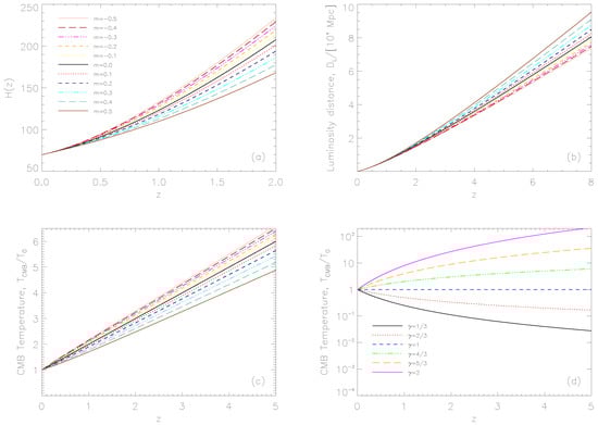 The figure shows as function of redshift the Hubble constant in panel (a), the luminosity distance in panel (b), and the CMB temperature in panels (c) and (d). Colors and lines indicate the different values assigned to the parameters m and to illustrate their impact on the observables.