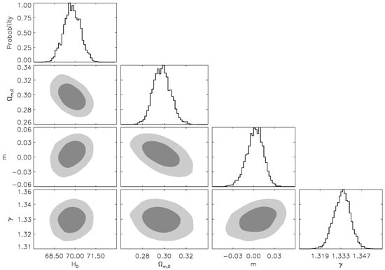 Following the aforementioned methodology, we carried out two sets of analysis: (A) we fit the whole parameter space composed by the Hubble constant , the matter density parameter , and m; and (B) we set and which are the best fit values of joint analysis of the CMB power spectrum and other probes [], while m and stay free to vary. All results are summarized in Table 2, and some comments are deserved.