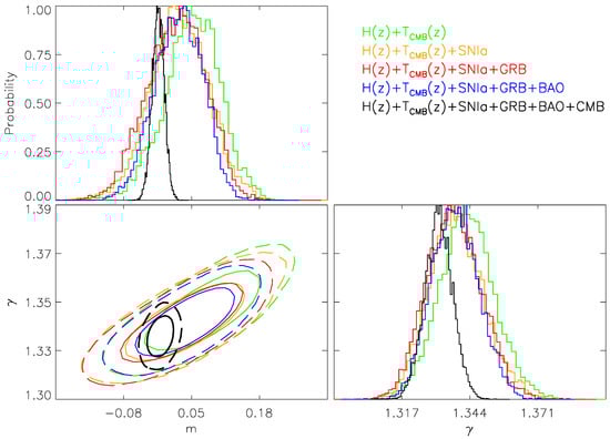 In the second analysis, and are fixed to the Planck 2018 best fit values, and the parameters m and are fully in agreement with their expected values. Our best constraint of the power law index is which means fully compatible with Planck 2018 results, and with a cosmological constant at . Moreover, to directly compare our results with the ones in [,], we carried out another analysis setting and leaving only m as free parameter. The constrained values of m with error is: , which represents a factor of improvement in over previous constraints.