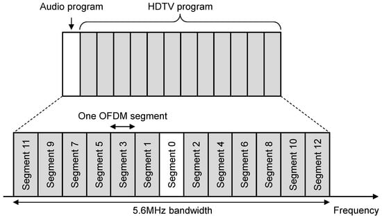 Orthogonal frequency division multiplexing (OFDM) is a multi-carrier technique that achieves a higher spectrum efficiency by using minimally spaced orthogonal subcarriers without increasing the implementation complexity. The success of OFDM is witnessed by its adoption into a lot of international digital television terrestrial broadcasting (DTTB) standards, including digital television/terrestrial multimedia broadcasting (DTMB), advanced television systems committee (ATSC) 3.0, digital video broadcasting-terrestrial-second generation (DVB-T2), and integrated services digital broadcasting-terrestrial (ISDB-T) [1,2,3,4]. Although many DTTB standards share a common OFDM framework, different technical features could be found [5,6]. The unique feature in ISDB-T is the use of band segmented transmission OFDM (BST-OFDM) to support different services and applications. A fundamental feature of BST-OFDM is the capability of using different coding and modulation schemes in one or more OFDM segments, which leads to the basis of hierarchical transmission [4,5,6]. In BST-OFDM, the entire band is equally divided into 13 segments with the same bandwidth, making it possible to transmit an HDTV program by combining 12 segments. Moreover, it is possible for an audio program to be received using one segment.