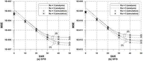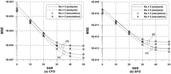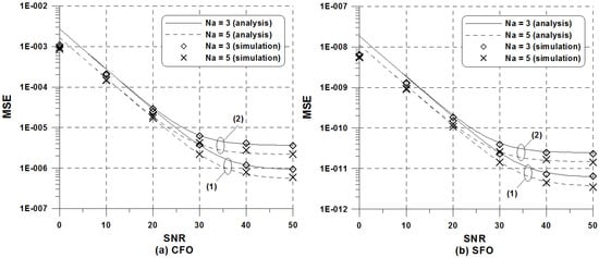 MSE of the proposed LS estimator versus when = 0.01: (a) CFO estimator; (b) SFO estimator.